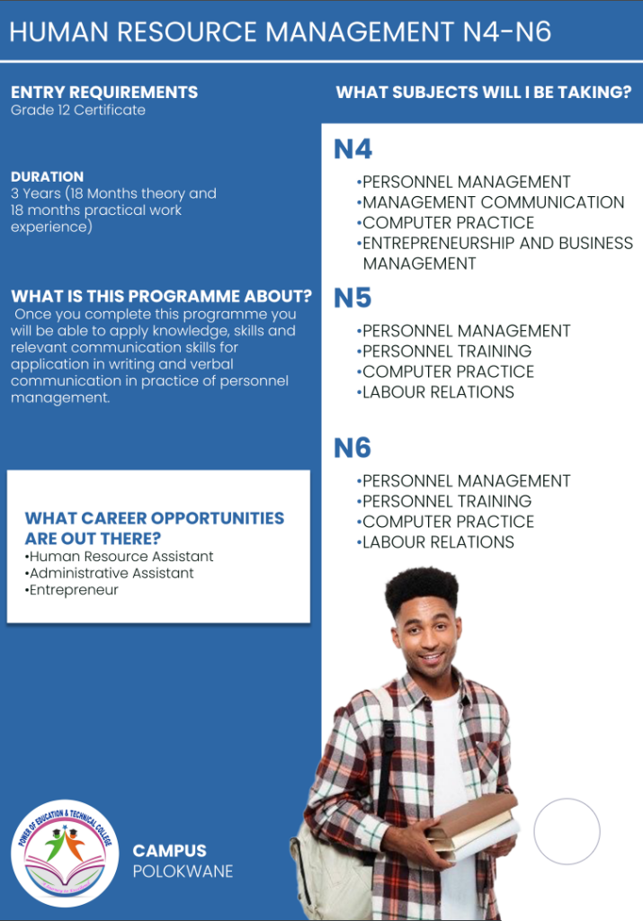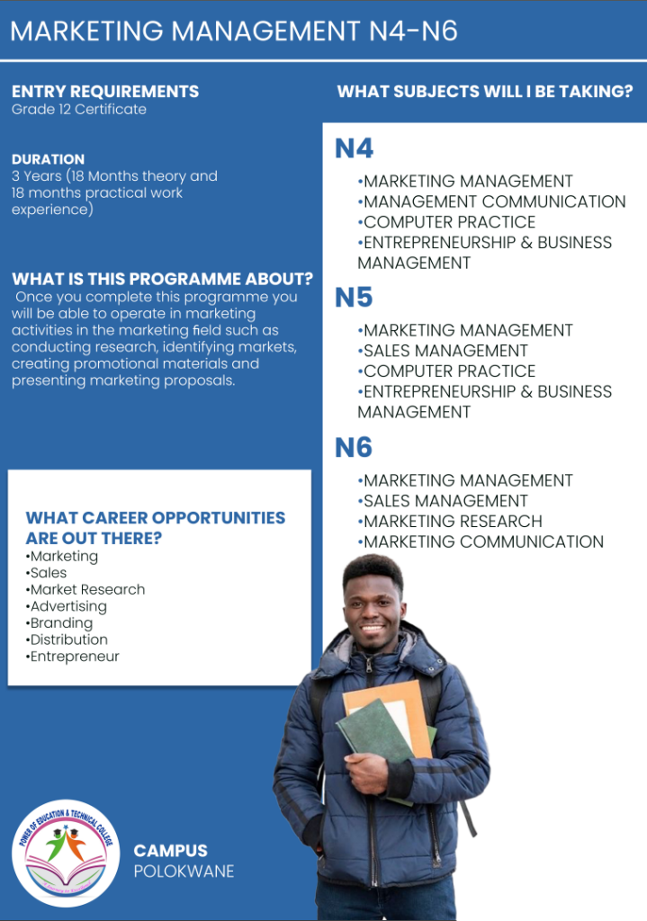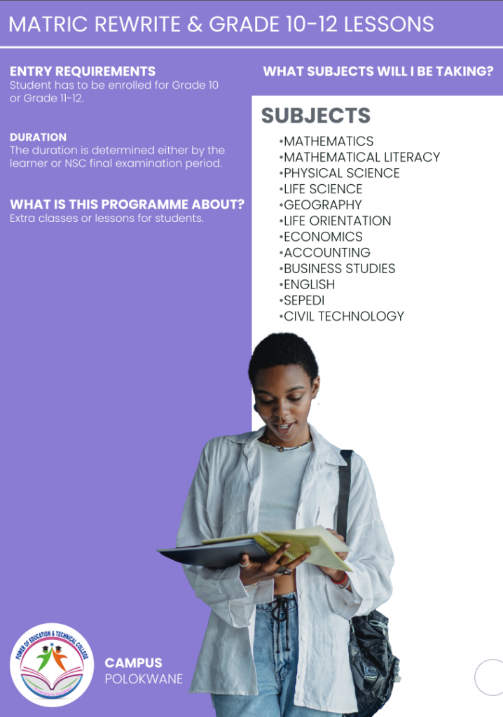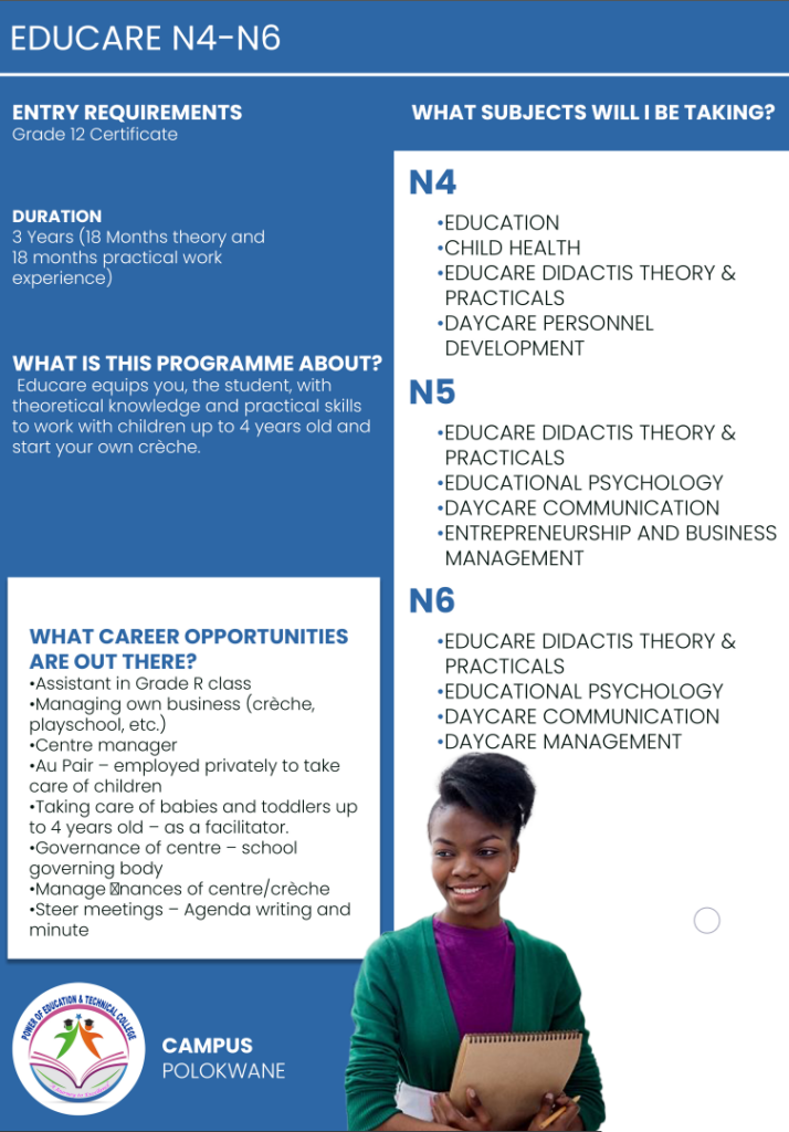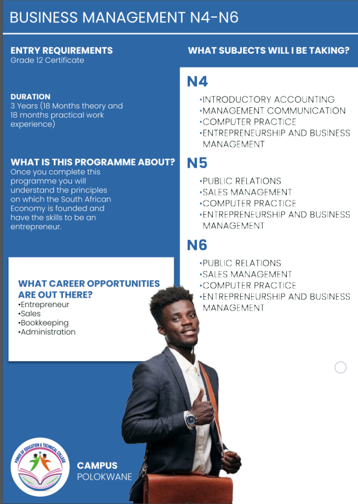 Power of Education and Technical College Polokwane Campus, this institution its aiming to meet the learning needs and aspirations of individuals through the development of their intellectual abilities and aptitudes throughout their lives. Higher education equips individuals to make the best use of their talents and of the opportunities offered by society for self- fulfilment.