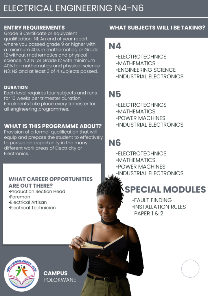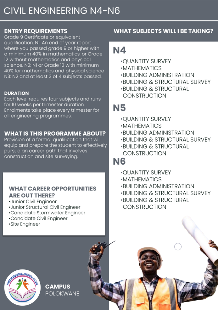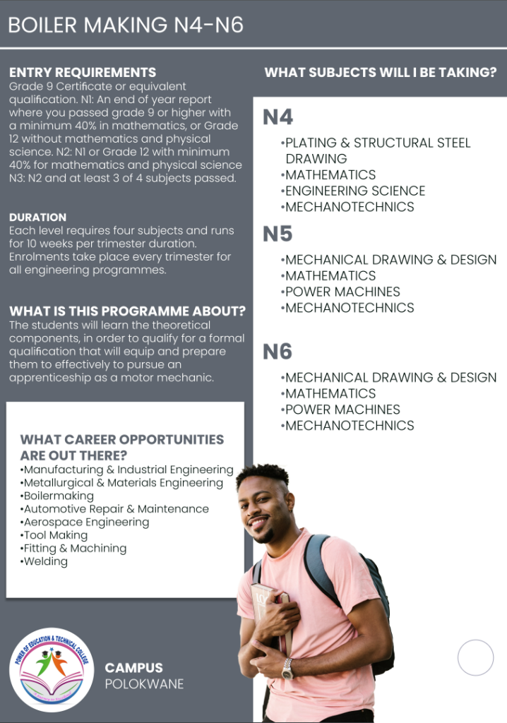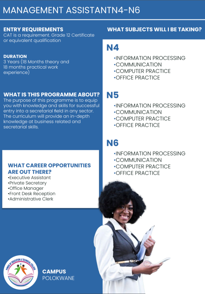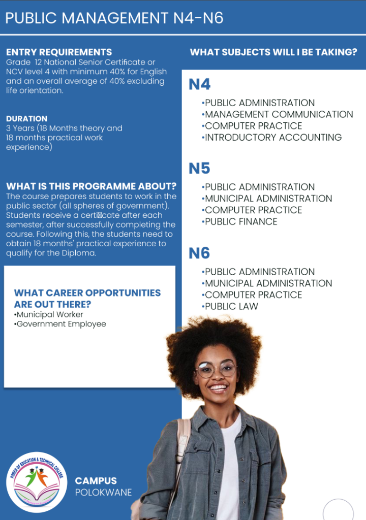 Power of Education and Technical College Polokwane Campus, this institution its aiming to meet the learning needs and aspirations of individuals through the development of their intellectual abilities and aptitudes throughout their lives. Higher education equips individuals to make the best use of their talents and of the opportunities offered by society for self- fulfilment.